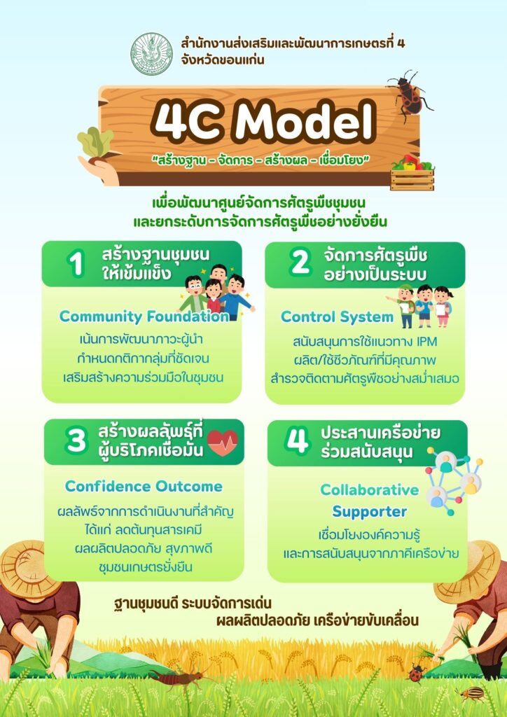 จากการลงพื้นที่ ศึกษาเอกสาร และถอดบทเรียนจากศูนย์ต้นแบบในภาคตะวันออกเฉียงเหนือ ได้แก่ ศจช.ตำบลฆ้องชัยพัฒนา จ.กาฬสินธุ์ เป็นศูนย์จัดการศัตรูพืชชุมชนดีเด่นระดับประเทศ ปี 2566 (รองชนะเลิศอันดับ 1) ศจช.ตำบลโนนศิลาเลิง จ.กาฬสินธ์ุ เป็นศูนย์จัดการศัตรูพืชชุมชนขับเคลื่อนโดยเกษตรกรรุ่นใหม่ (Young Smart Farmer) และ ศจช.บ้านสวนใหม่ จ.บุรีรัมย์ เป็นศูนย์จัดการศัตรูพืชชุมชนดีเด่นระดับจังหวัด จ.บุรีรัมย์ ในปี 2558 นำมาสู่รูปแบบการพัฒนา “4C Model” เครื่องมือที่ช่วยให้เจ้าหน้าที่ “เห็นภาพ-เข้าใจง่าย-นำไปใช้ได้ทันที”